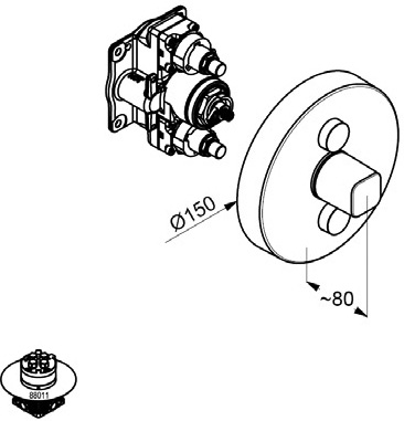 Trim set with functional unit with pushbutton for control by two consumers ceramic rotary cartridge with hot water limitation cover plate150 mm without concealed installation set 88011